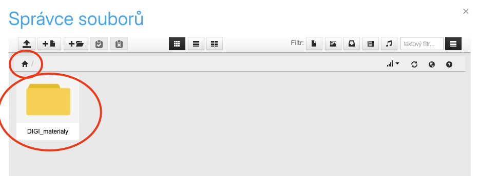 V administraci eshopu klikněte v levém menu na „Vzhled a obsah“ a poté na „Správce souborů“. Přímo v rootu (v kořenové složce – na úrovni domečku v drobečkové navigaci – viz obrázek) založte složku, kam budete všechny PDF nahrávat.