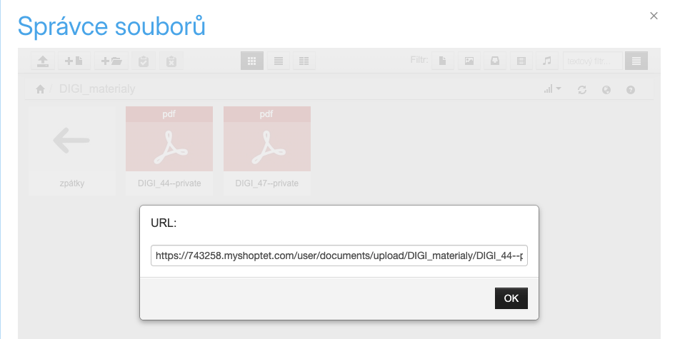 Následně do této složky nahrajte alespoň jedno PDF. Poté na něj klikněte pravým tlačítkem a zvolte „Zobrazit URL adresu“. Tato adresa bude vypadat podobně – viz obrázek a URL níže.