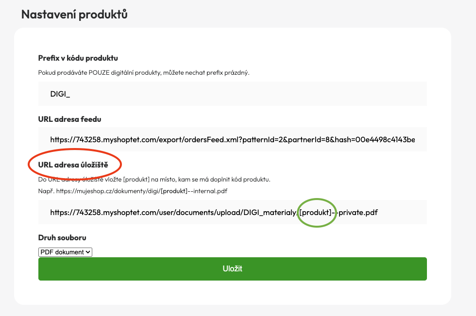 Při vkládání změňte ještě kód produktu – viz zelené kolečko na obrázku výše (v našem případě „DIGI_44“) na [produkt]. Výsledná URL adresa bude vypadat nějak takto:
