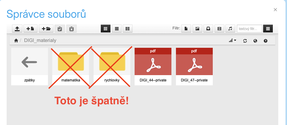 Nejde zakládat další podsložky nebo vkládat PDF soubory do jiných složek mimo vaše založené „DIGI_materialy“. Viz obrázek níže, kde je to špatně, nesmí tam být další podsložky.